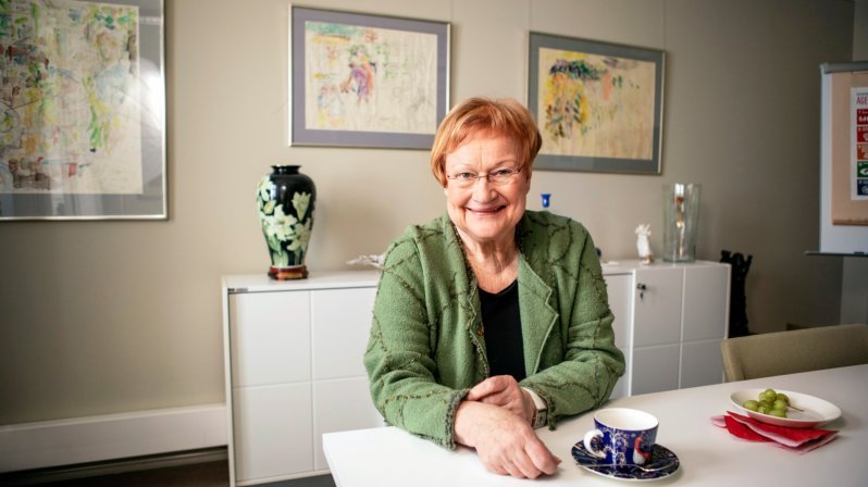 President Tarja Halonen, 78, hälsar oss välkomna till sitt kontor och vi går genom foajén till ett ljust mötesrum.